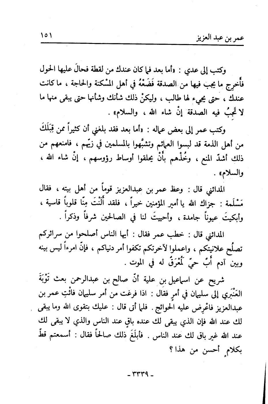 شريح عن إسماعيل بن علية أن صالح بن عبد الرحمن بعث توبة العنبري إلى سليمان في أمر فقال: إذا فرغت من أمر سليمان فائت عمر بن عبد العزيز فاعرض عليه الحوائج. فلما أتى قال: عليك بتقوى الله وما يبقى لك عند الله فإن الذي يبقى لك عنده باق عند الناس والذي لا يبقى لك عند الله غير باق لك عند الناس. فأبلغ ذلك صالحا فقال: أسمعتم قط بكلام أحسن من هذا؟