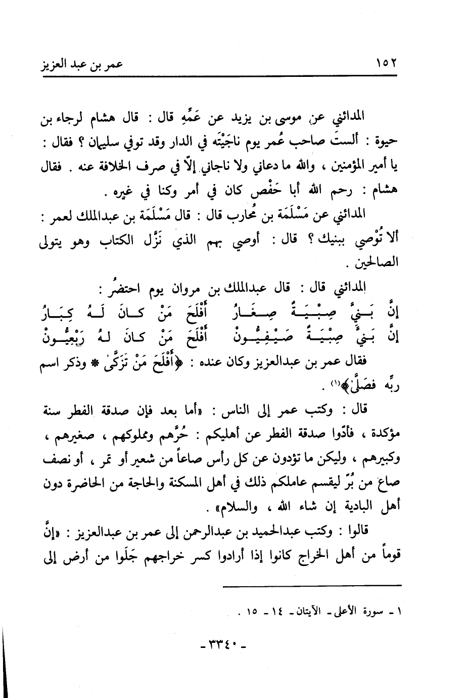 فقال عمر بن عبد العزيز وكان عنده: (أَفْلَحَ مَنْ تَزَكَّى. وَذَكَرَ اسْمَ رَبِّهِ فَصَلَّى) [1] .