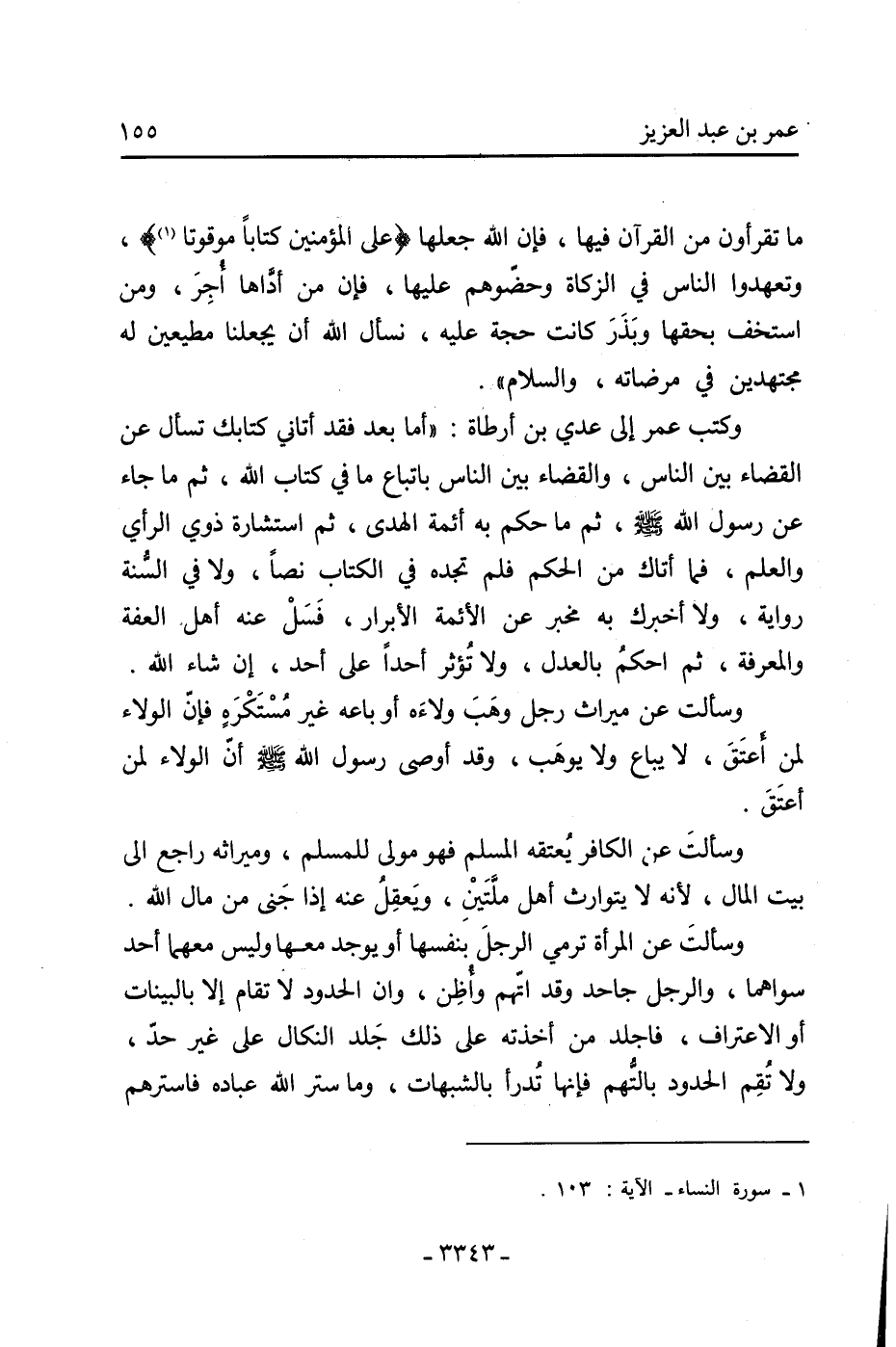 وكتب عمر إلى عدي بن أرطاة: «أما بعد فقد أتاني كتابك تسأل عن القضاء بين الناس، والقضاء بين الناس باتباع ما في كتاب الله، ثم ما جاء عن رسول الله صلى الله عليه وسلم، ثم ما حكم به أئمة الهدى، ثم استشارة ذوي الرأي والعلم، فما أتاك من الحكم فلم تجده في الكتاب نصا، ولا في السنة رواية، ولا أخبرك به مخبر عن الأئمة الأبرار، فسل عنه أهل العفة والمعرفة، ثم احكم بالعدل، ولا تؤثر أحدا على أحد، إن شاء الله.
