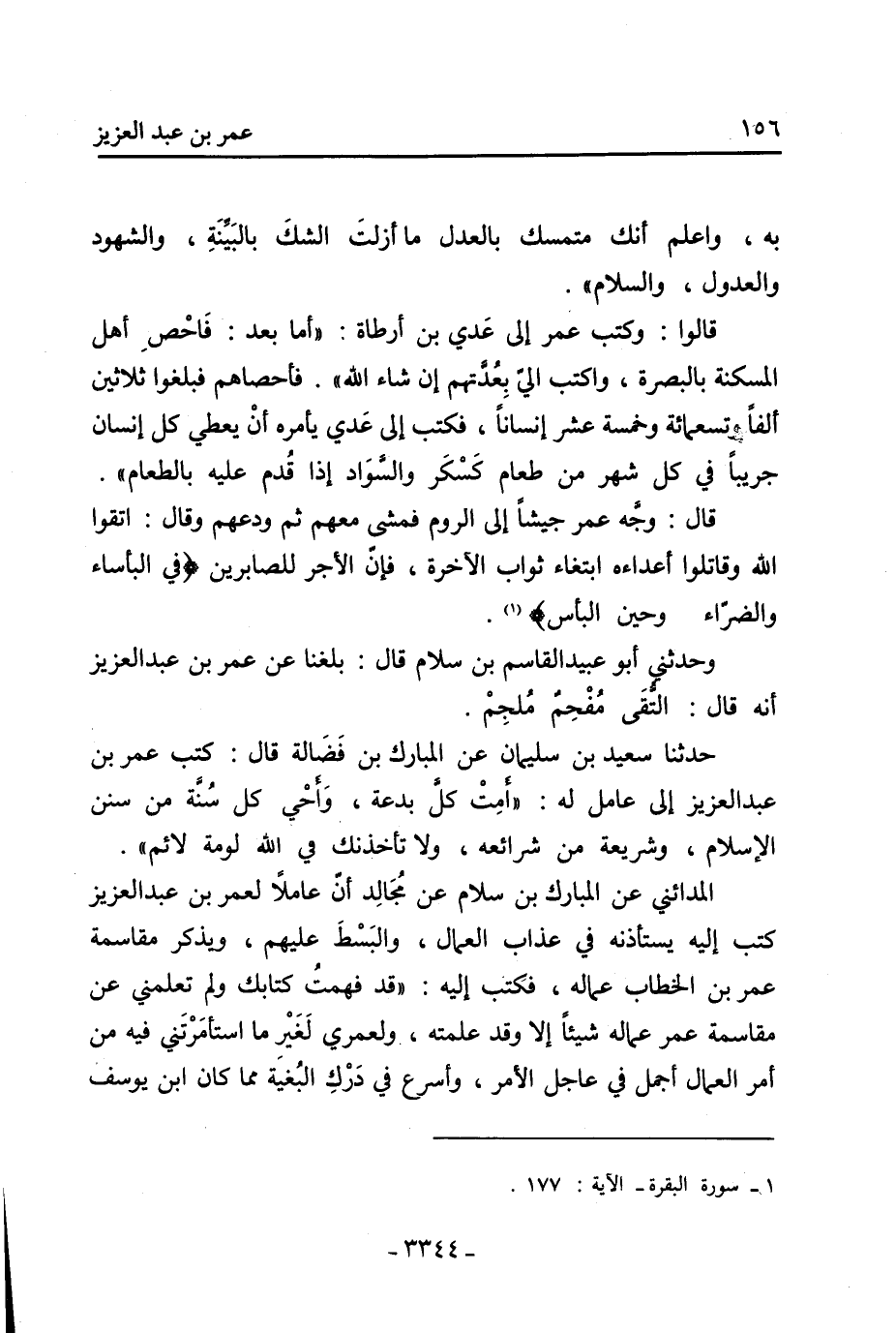 قال: وجه عمر جيشا إلى الروم فمشى معهم ثم ودعهم وقال: اتقوا الله وقاتلوا أعداءه ابتغاء ثواب الآخرة، فإن الأجر للصابرين (فِي الْبَأْسَاءِ وَالضَّرَّاءِ وَحِينَ الْبَأْسِ) [1] .
