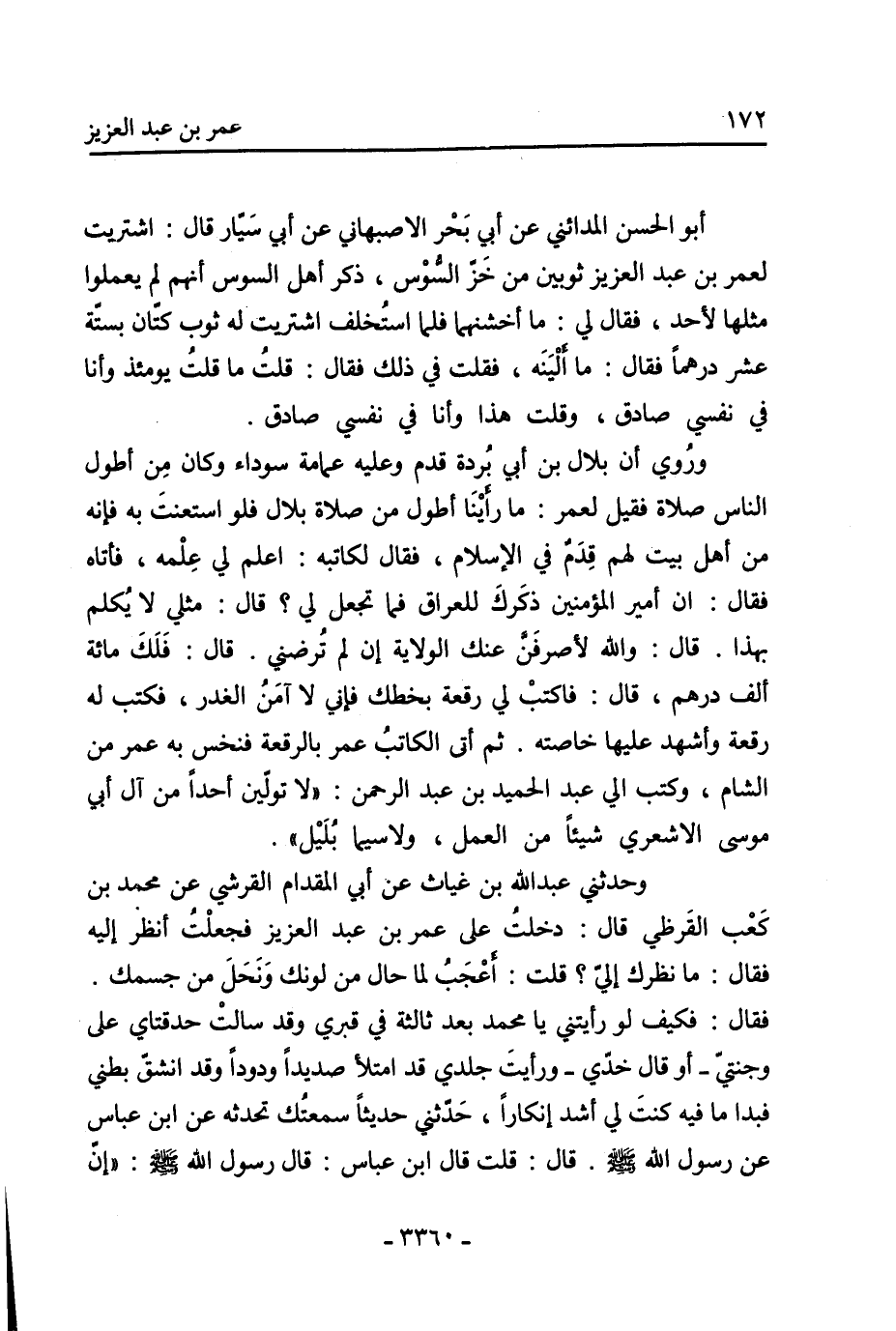أبو الحسن المدائني عن أبي بحر الأصبهاني عن أبي سيار قال: اشتريت لعمر بن عبد العزيز ثوبين من خز السوس، ذكر أهل السوس أنهم لم يعملوا مثلها لأحد، فقال لي: ما أخشنهما فلما استخلف اشتريت له ثوب كتان بستة عشر درهما فقال: ما ألينه، فقلت في ذلك فقال: قلت ما قلت يومئذ وأنا في نفسي صادق، وقلت هذا وأنا في نفسي صادق.