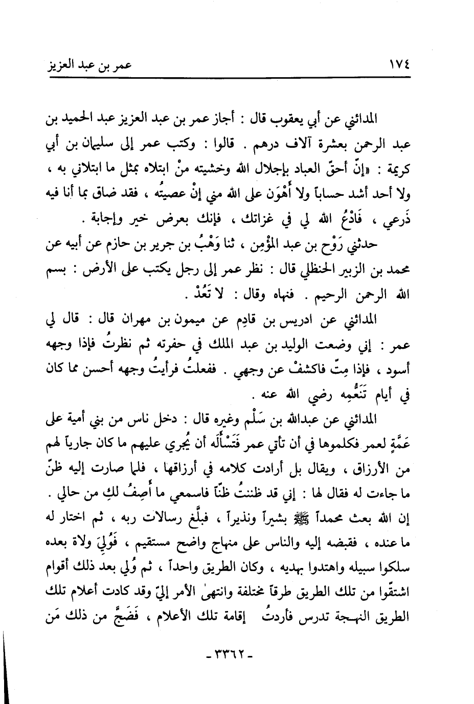 المدائني عن أبي يعقوب قال: أجاز عمر بن عبد العزيز عبد الحميد بن عبد الرحمن بعشرة آلاف درهم. قالوا: وكتب عمر إلى سليمان بن أبي كريمة: «إن أحق العباد بإجلال الله وخشيته من ابتلاه بمثل ما ابتلاني به، ولا أحد أشد حسابا ولا أهون على الله مني إن عصيته، فقد ضاق بما أنا فيه ذرعي، فادع الله لي في غزاتك، فإنك بعرض خير وإجابة.