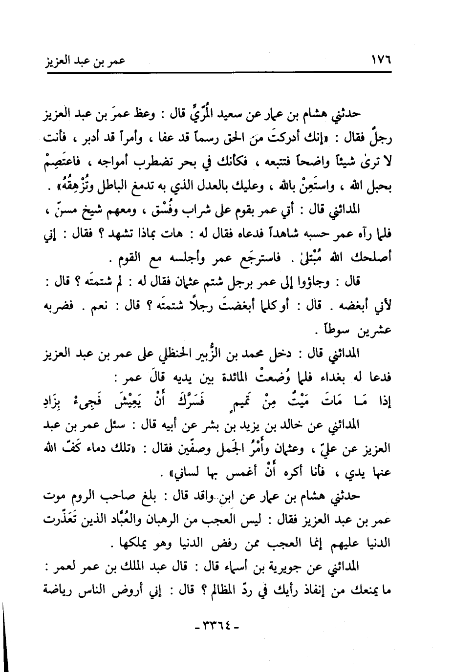 حدثني هشام بن عمار عن سعيد المري قال: وعظ عمر بن عبد العزيز رجل فقال: «إنك أدركت من الحق رسما قد عفا، وأمرا قد أدبر، فأنت لا ترى شيئا واضحا فتتبعه، فكأنك في بحر تضطرب أمواجه، فاعتصم بحبل الله، واستعن بالله، وعليك بالعدل الذي به تدمغ الباطل وتزهقه» .