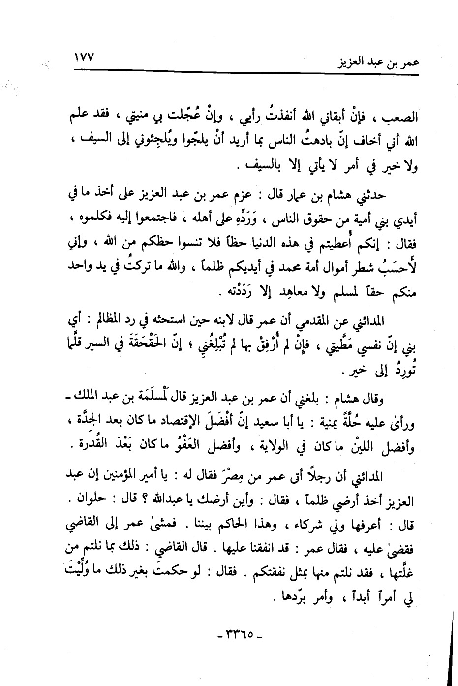 حدثني هشام بن عمار قال: عزم عمر بن عبد العزيز على أخذ ما في أيدي بني أمية من حقوق الناس، ورده على أهله، فاجتمعوا إليه فكلموه، فقال: إنكم أعطيتم في هذه الدنيا حظا فلا تنسوا حظكم من الله، وإني لأحسب شطر أموال أمة محمد في أيديكم ظلما، والله ما تركت في يد واحد منكم حقا لمسلم ولا معاهد إلا رددته.