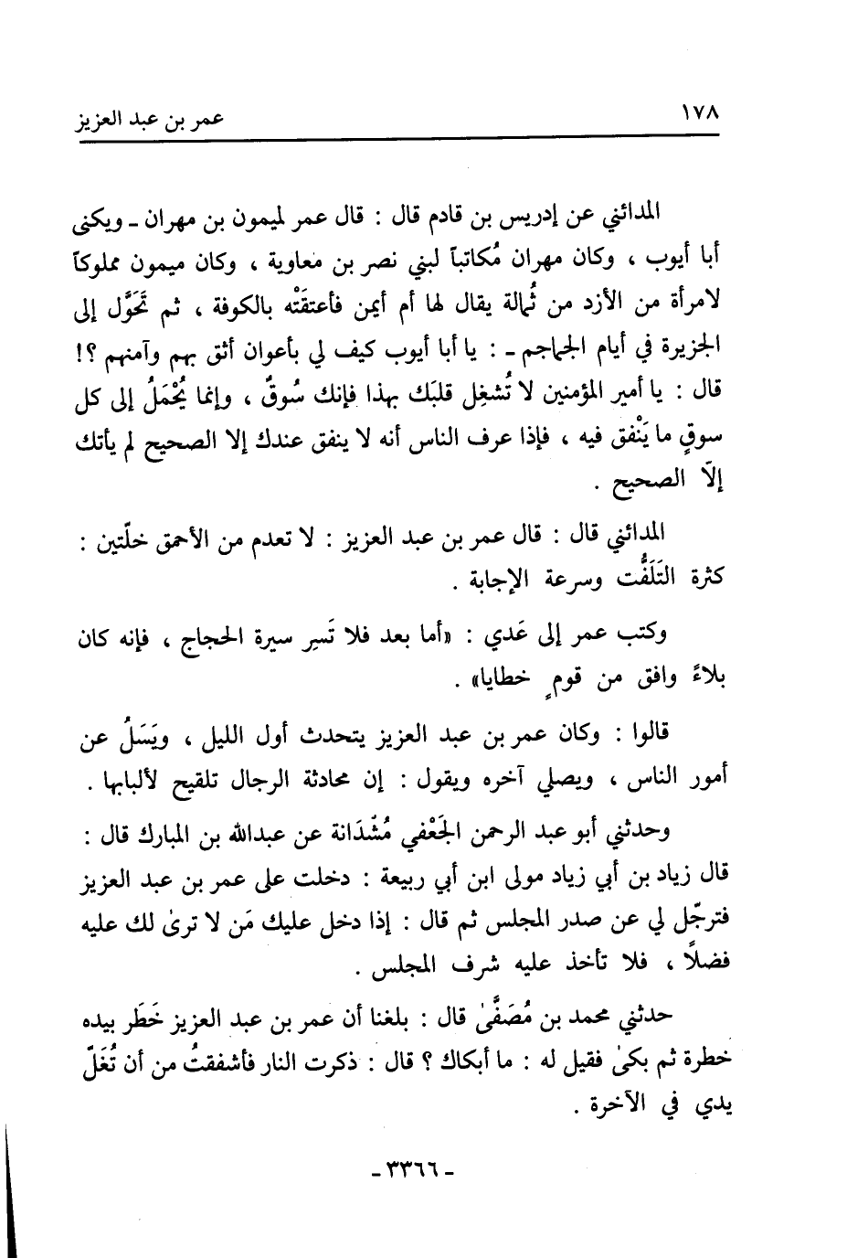 المدائني عن إدريس بن قادم قال: قال عمر لميمون بن مهران- ويكنى أبا أيوب، وكان مهران مكاتبا لبني نصر بن معاوية، وكان ميمون مملوكا لامرأة من الأزد من ثمالة يقال لها أم أيمن فأعتقته بالكوفة، ثم تحول إلى الجزيرة في أيام الجماجم-: يا أبا أيوب كيف لي بأعوان أثق بهم وآمنهم؟! قال: يا أمير المؤمنين لا تشغل قلبك بهذا فإنك سوق، وإنما يحمل إلى كل سوق ما ينفق فيه، فإذا عرف الناس أنه لا ينفق عندك إلا الصحيح لم يأتك إلا الصحيح.