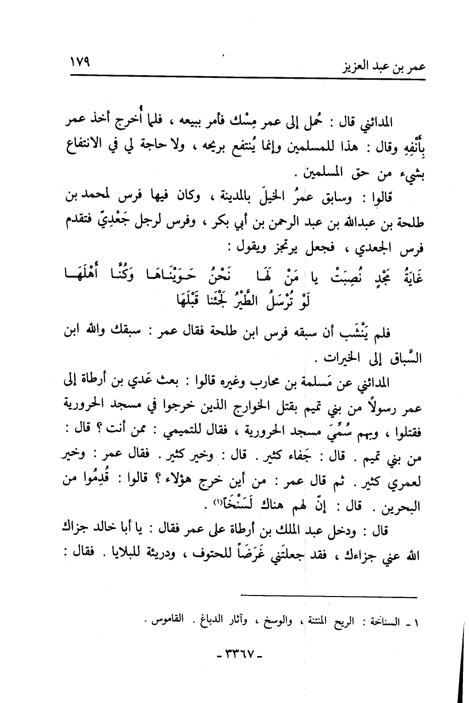 المدائني قال: حمل إلى عمر مسك فأمر ببيعه، فلما أخرج أخذ عمر بأنفه وقال: هذا للمسلمين وإنما ينتفع بريحه، ولا حاجة لي في الانتفاع بشيء من حق المسلمين.