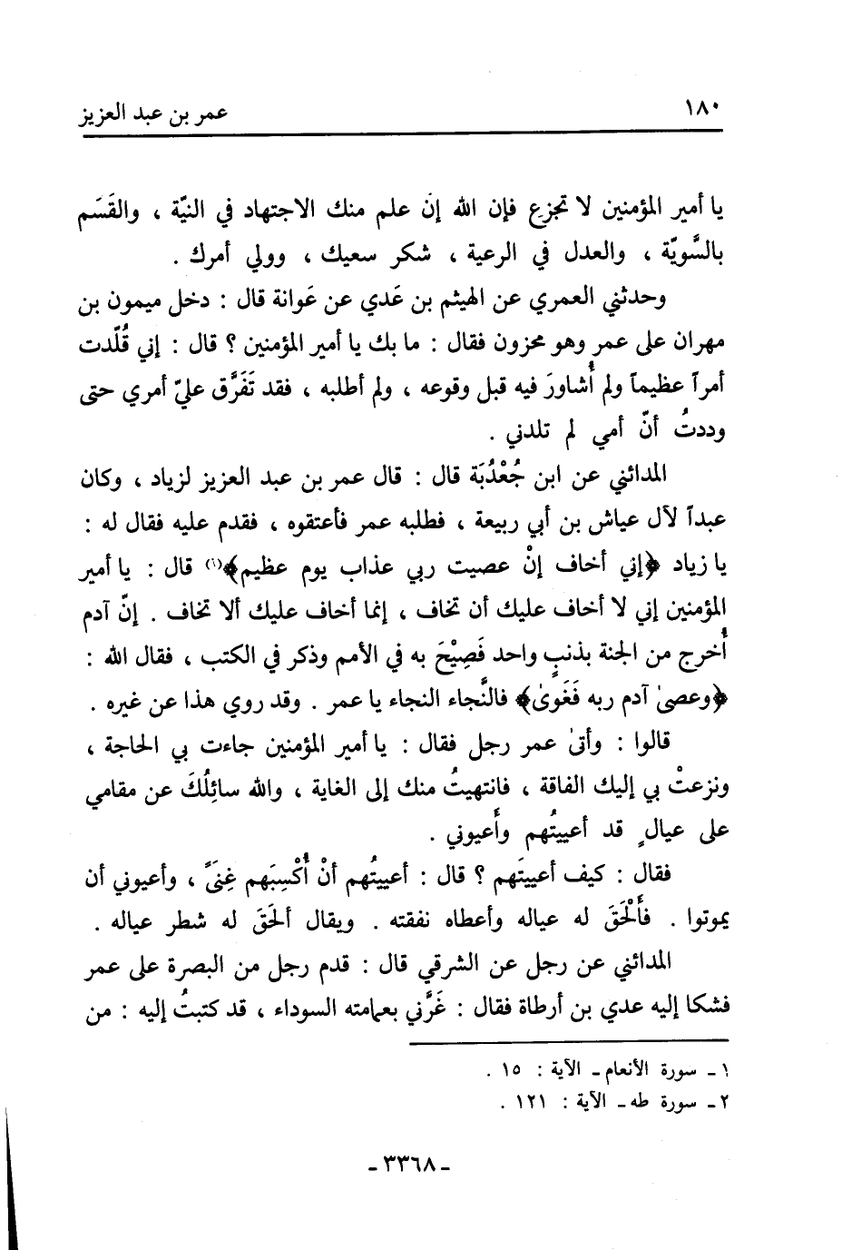 وحدثني الْعُمَرِيُّ عَنِ الْهَيْثَمِ بْنِ عَدِيٍّ عَنْ عَوَانَةَ قال: دخل ميمون بن مهران على عمر وهو محزون فقال: ما بك يا أمير المؤمنين؟ قال: إني قلدت أمرا عظيما ولم أشاور فيه قبل وقوعه، ولم أطلبه، فقد تفرق علي أمري حتى وددت أن أمي لم تلدني.