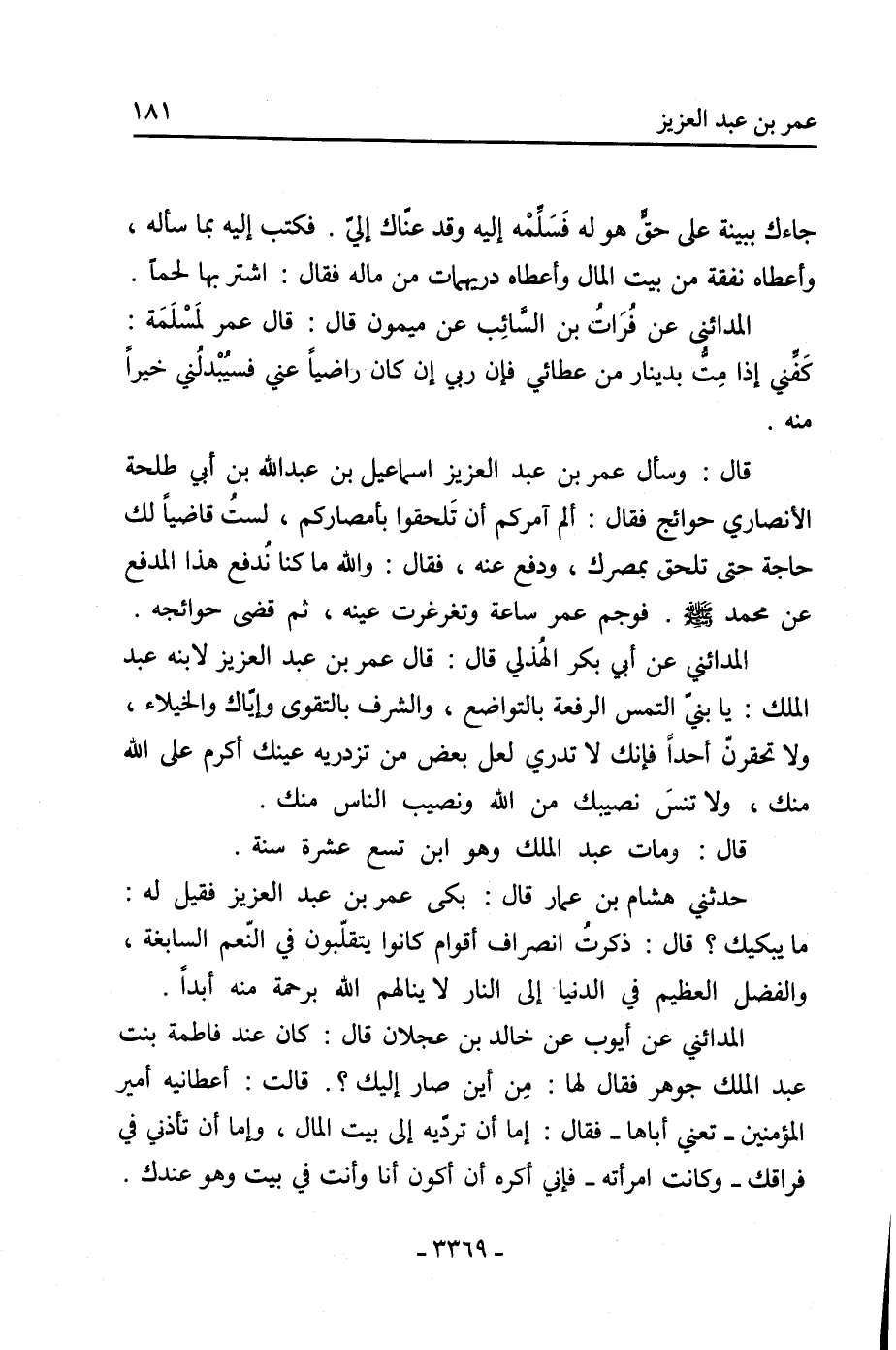 المدائني عن أيوب عن خالد بن عجلان قال: كان عند فاطمة بنت عبد الملك جوهر فقال لها: من أين صار إليك؟. قالت: أعطانيه أمير المؤمنين- تعني أباها- فقال: إما أن ترديه إلى بيت المال، وإما أن تأذني في فراقك- وكانت امرأته- فإني أكره أن أكون أنا وأنت في بيت وهو عندك.