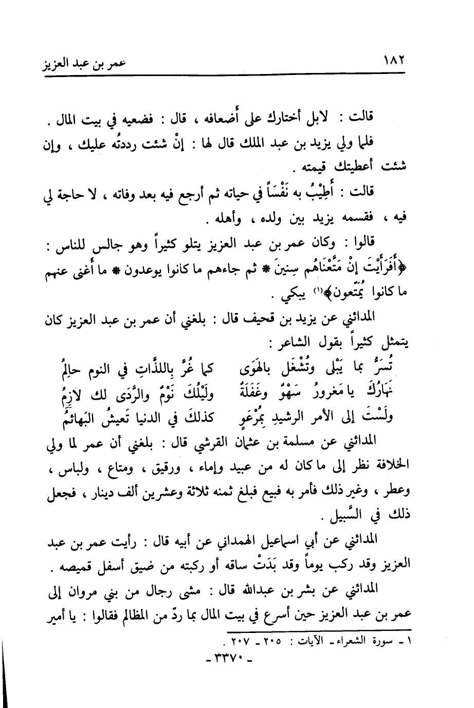 المدائني عن يزيد بن قحيف قال: بلغني أن عمر بن عبد العزيز كان يتمثل كثيرا بقول الشاعر: