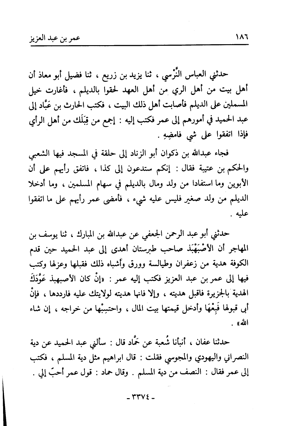 حدثنا عفان، أنبأنا شعبة عن حماد قال: سألني عبد الحميد عن دية النصراني واليهودي والمجوسي فقلت: قال إبراهيم مثل دية المسلم، فكتب إلى عمر فقال: النصف من دية المسلم. وقال حماد: قول عمر أحب إلي.