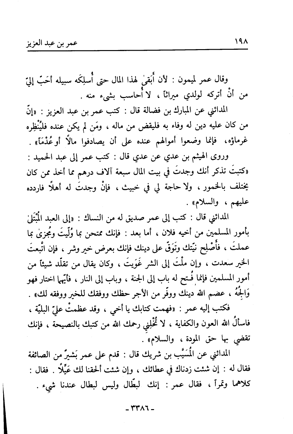 «كتبت تذكر أنك وجدت في بيت المال سبعة آلاف درهم مما أخذ ممن كان يختلف بالخمور، ولا حاجة لي في خبيث، فإن وجدت له أهلًا فاردده عليهم، والسلام» .