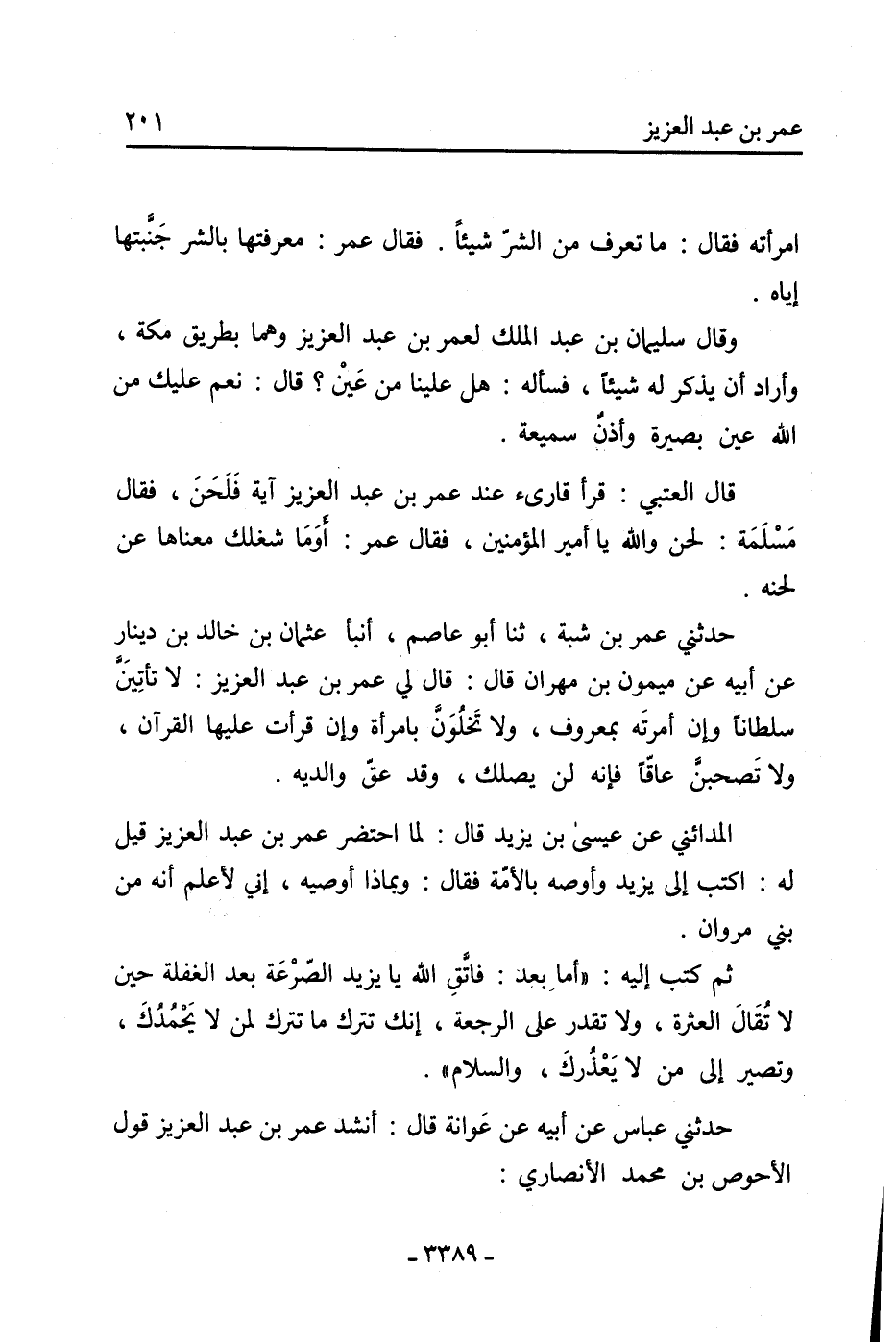 حَدَّثَنِي عُمَرُ بْنُ شَبَّةَ، ثنا أَبُو عَاصِمٍ، أنبأ عثمان بن خالد بن دينار عن أبيه عن ميمون بن مهران قال: قال لي عمر بن عبد العزيز: لا تأتين سلطانا وإن أمرته بمعروف، ولا تخلون بامرأة وإن قرأت عليها القرآن، ولا تصحبن عاقا فإنه لن يصلك، وقد عق والديه.