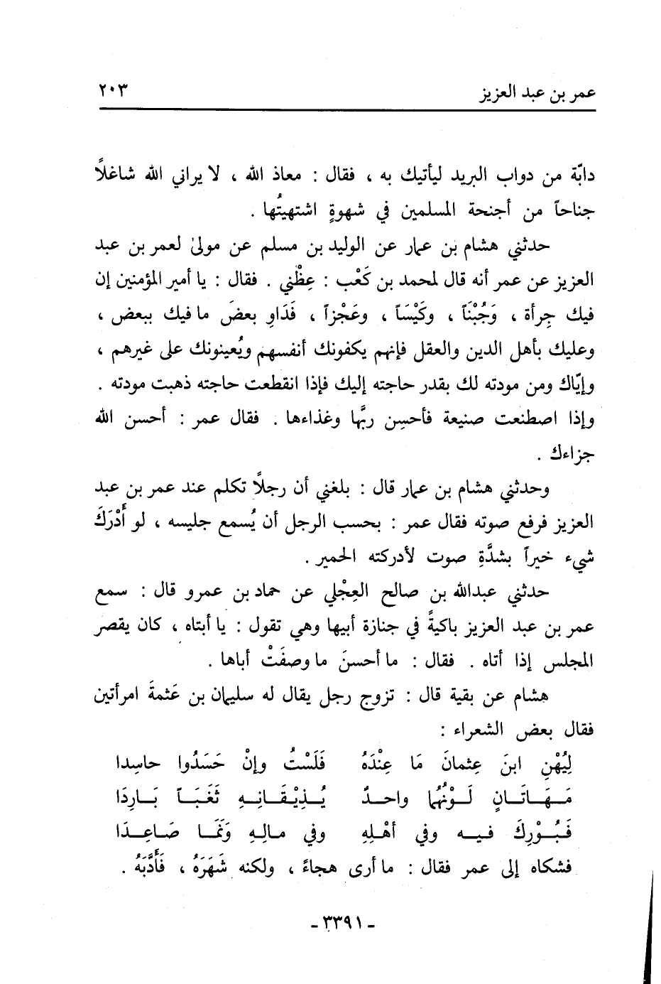 وحدثني هشام بن عمار قال: بلغني أن رجلًا تكلم عند عمر بن عبد العزيز فرفع صوته فقال عمر: بحسب الرجل أن يسمع جليسه، لو أدرك شيء خيرا بشدة صوت لأدركته الحمير.