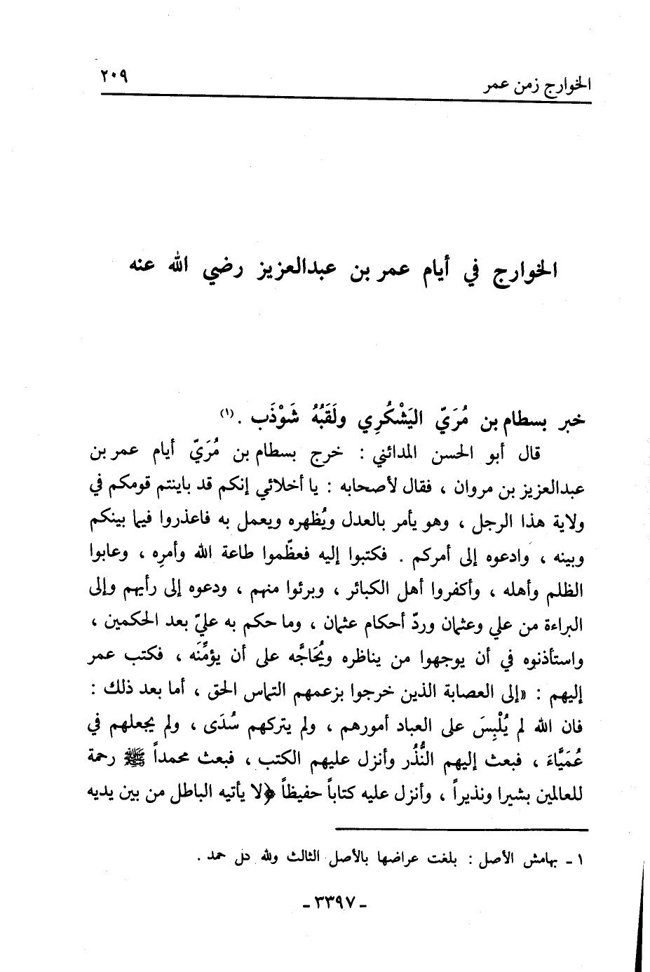 قال أبو الحسن المدائني. خرج بسطام بن مري أيام عمر بن عبد العزيز بن مروان، فقال لأصحابه: يا أخلائي إنكم قد باينتم قومكم في ولاية هذا الرجل، وهو يأمر بالعدل ويظهره ويعمل به فاعذروا فيما بينكم وبينه، وادعوه إلى أمركم. فكتبوا إليه فعظموا طاعة الله وأمره، وعابوا الظلم وأهله، وأكفروا أهل الكبائر، وبرئوا منهم، ودعوه إلى رأيهم وإلى البراءة من علي وعثمان ورد أحكام عثمان، وما حكم به علي بعد الحكمين، واستأذنوه في أن يوجهوا من يناظره ويحاجه على أن يؤمنه، فكتب عمر إليهم: «إلى العصابة الذين خرجوا بزعمهم التماس الحق، أما بعد ذلك: