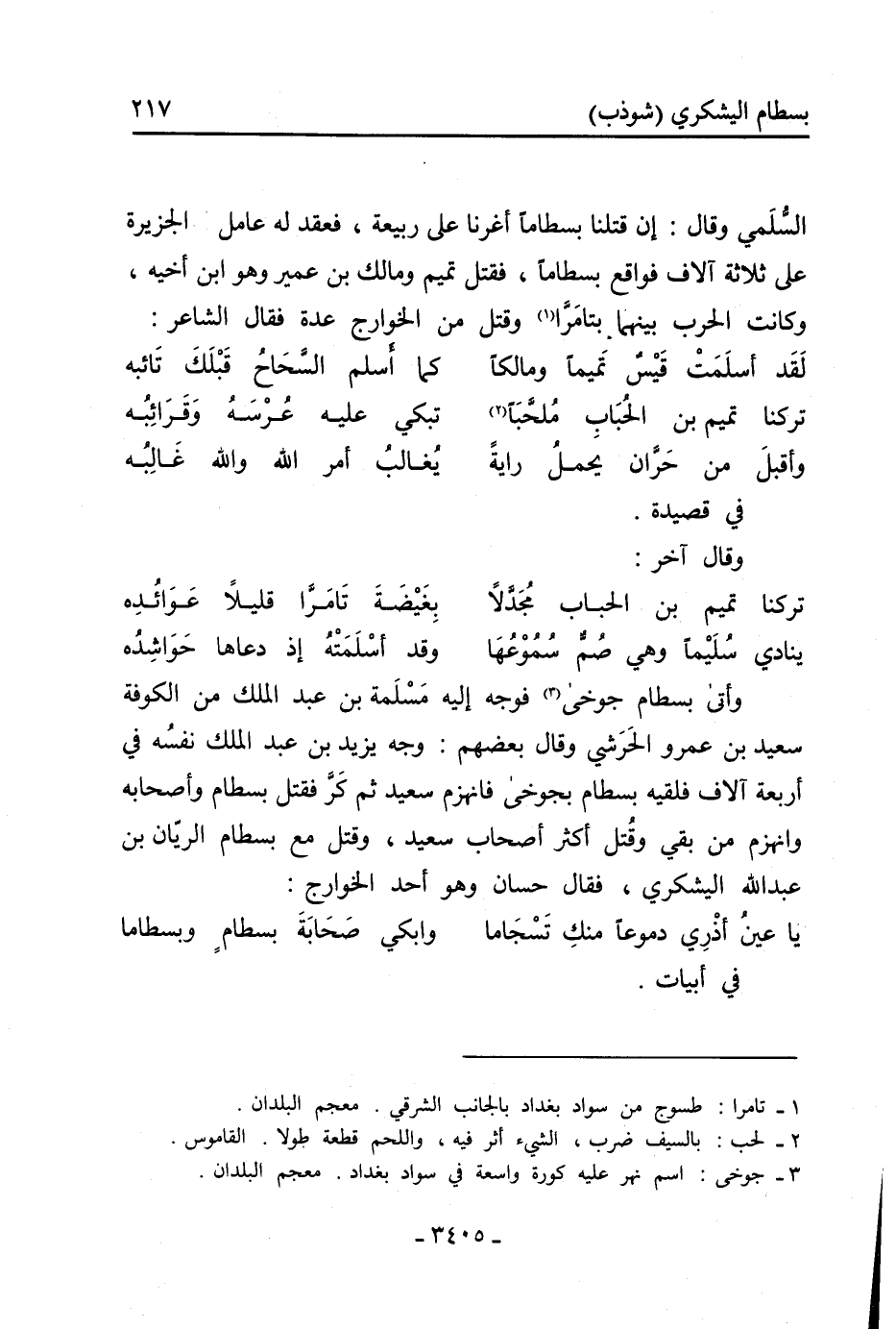 السلمي وقال: إن قتلنا بسطاما أغرنا على ربيعة، فعقد له عامل الجزيرة على ثلاثة آلاف فواقع بسطاما، فقتل تميم ومالك بن عمير وهو ابن أخيه، وكانت الحرب بينهما بتامرا [1] وقتل من الخوارج عدة فقال الشاعر: