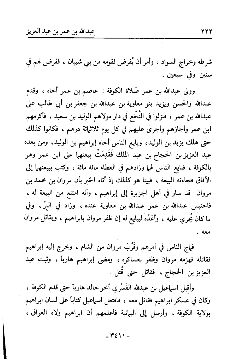 وولى عبد الله بن عمر صلاة الكوفة: عاصم بن عمر أخاه، وقدم عبد الله والحسن ويزيد بنو مُعَاوِيَة بْن عَبْدِ اللَّهِ بْن جَعْفَر بْن أبي طالب على عبد الله بن عمر، فنزلوا في النخع في دار مولاهم الوليد بن سعيد، فأكرمهم ابن عمر وأجازهم وأجرى عليهم في كل يوم ثلاثمائة درهم، فكانوا كذلك حتى هلك يزيد بن الوليد، وبايع الناس أخاه إبراهيم بن الوليد، ومن بعده عبد العزيز بن الحجاج بن عبد الملك فقدمت بيعتهما على ابن عمر وهو بالكوفة، فبايع الناس لهما وزادهم في العطاء مائة مائة، وكتب ببيعتهما إلى الآفاق فجاءته البيعة، فبينا هو كذلك إذ أتاه الخبر بأن مروان بن محمد بن مروان قد سار في أهل الجزيرة إلى إبراهيم، وأنه امتنع من البيعة له، فاحتبس عبد الله بن عمر عبد الله بن معاوية عنده، وزاد في البر، وفي ما كان يجري عليه، وأعده ليبايع له إن ظفر مروان بإبراهيم، ويقاتل مروان معه.