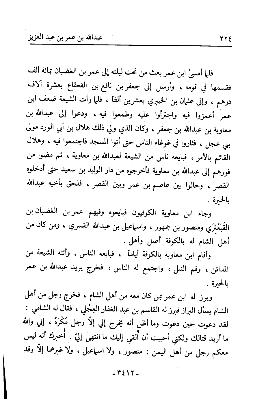 فلما أمسى ابن عمر بعث من تحت ليلته إلى عمر بن الغضبان بمائة ألف فقسمها في قومه، وأرسل إلى جعفر بن نافع بن القعقاع بعشرة آلاف درهم، وإلى عثمان بن الخيبري بعشرين ألفا، فلما رأت الشيعة ضعف ابن عمر أغمزوا فيه واجترأوا عليه وطمعوا فيه، ودعوا إلى عَبْد اللَّهِ بْن مُعَاوِيَة بْن عَبْدِ اللَّهِ بن جعفر، وكان الذي ولي ذلك هلال بن أبي الورد مولى بني عجل، فثاروا في غوغاء الناس حتى أتوا المسجد فاجتمعوا فيه، وهلال القائم بالأمر، فبايعه ناس من الشيعة لعبد الله بن معاوية، ثم مضوا من فورهم إلى عبد الله بن معاوية فأخرجوه من دار الوليد بن سعيد حتى أدخلوه القصر، وحالوا بين عاصم بن عمر وبين القصر، فلحق بأخيه عبد الله بالحيرة.