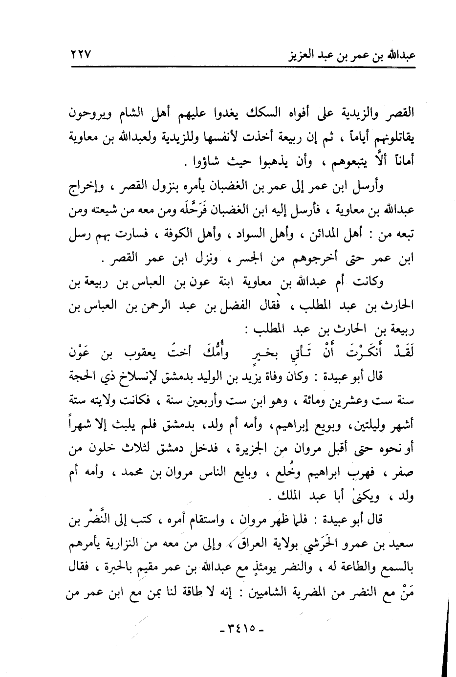 قال أبو عبيدة: فلما ظهر مروان، واستقام أمره، كتب إلى النضر بن سعيد بن عمرو الحرشي بولاية العراق، وإلى من معه من النزارية يأمرهم بالسمع والطاعة له، والنضر يومئذ مع عبد الله بن عمر مقيم بالحيرة، فقال من مع النضر من المضرية الشاميين: إنه لا طاقة لنا بمن مع ابن عمر من