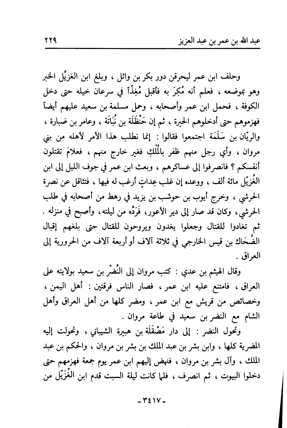 وحلف ابن عمر ليحرقن دور بكر بن وائل، وبلغ ابن الغزيل الخبر وهو بموضعه، فعلم أنه مكر به فأقبل مغذا في سرعان خيله حتى دخل الكوفة، فحمل ابن عمر وأصحابه، وحمل مسلمة بن سعيد عليهم أيضا فهزموهم حتى أدخلوهم الحيرة، ثم أن حنظلة بن نباته، وعامر بن ضبارة، والريان بن سلمة اجتمعوا فقالوا: إنما نطلب هذا الأمر لأهله من بني مروان، وأي رجل منهم ظفر بالملك فغير خارج منهم، فعلام تقتلون أنفسكم؟ فانصرفوا إلى عساكرهم، وبعث ابن عمر في جوف الليل إلى ابن الغزيل مائة ألف، ووعده إن غلب عدات أرغب له فيها، فتثاقل عن نصرة الحرشي، وخرج أيوب بن حوشب بن يزيد في رهط من أصحابه في طلب الحرشي، وكان قد صار إلى دير الأعور، فرده من ليلته، وأصبح في منزله.