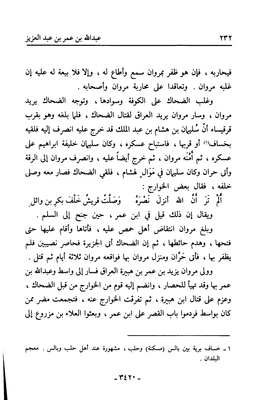 وغلب الضحاك على الكوفة وسوادها، وتوجه الضحاك يريد مروان، وسار مروان يريد العراق لقتال الضحاك، فلما بلغه وهو بقرب قرقيساء أن سليمان بن هشام بن عبد الملك قد خرج عليه انصرف إليه فلقيه بخساف [1] أو قربها، فاستباح عسكره، وكان سليمان خليفة إبراهيم على عسكره، ثم أمنه مروان، ثم خرج أيضا عليه، وانصرف مروان إلى الرقة وأتى حران وكان سليمان في موال لهشام، فلقي الضحاك فصار معه وصلى خلفه، فقال بعض الخوارج: