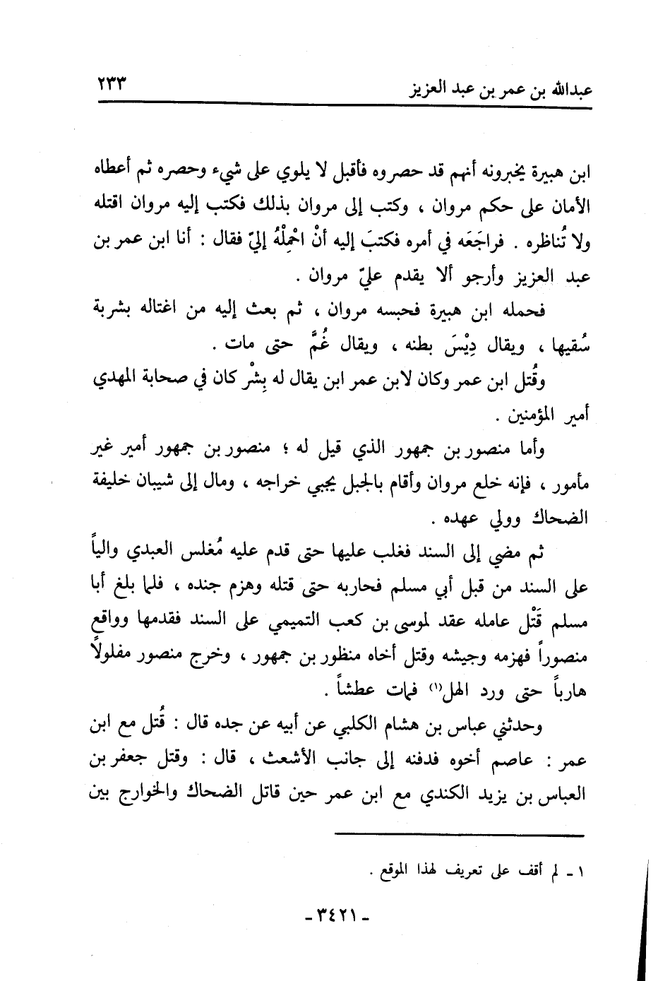 ابن هبيرة يخبرونه أنهم قد حصروه فأقبل لا يلوي على شيء وحصره ثم أعطاه الأمان على حكم مروان، وكتب إلى مروان بذلك فكتب إليه مروان اقتله ولا تناظره. فراجعه في أمره فكتب إليه أن احمله إلي فقال: أنا ابن عمر بن عبد العزيز وأرجو ألا يقدم علي مروان.