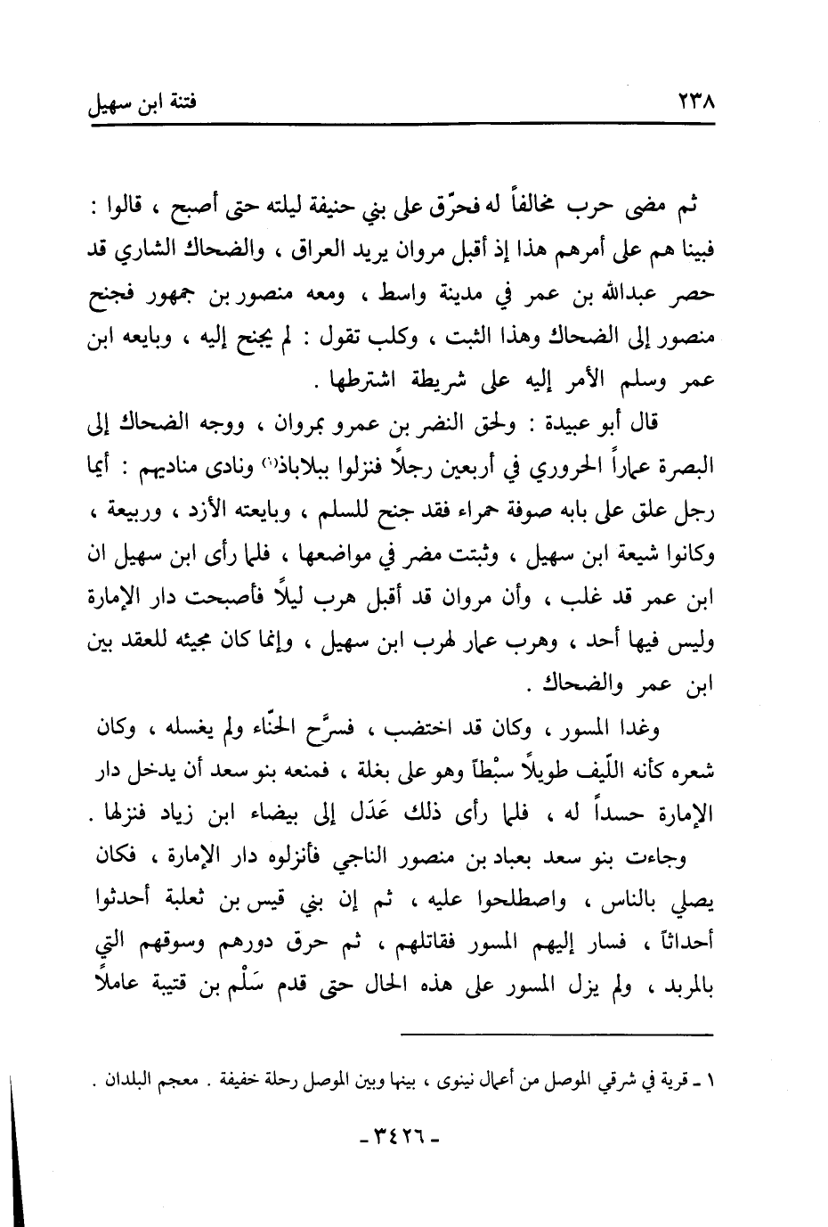 قال أبو عبيدة: ولحق النضر بن عمرو بمروان، ووجه الضحاك إلى البصرة عمارا الحروري في أربعين رجلًا فنزلوا ببلاباذ [1] ونادى مناديهم: أيما رجل علق على بابه صوفة حمراء فقد جنح للسلم، وبايعته الأزد، وربيعة، وكانوا شيعة ابن سهيل، وثبتت مضر في مواضعها، فلما رأى ابن سهيل إن ابن عمر قد غلب، وأن مروان قد أقبل هرب ليلًا فأصبحت دار الإمارة وليس فيها أحد، وهرب عمار لهرب ابن سهيل، وإنما كان مجيئه للعقد بين ابن عمر والضحاك.