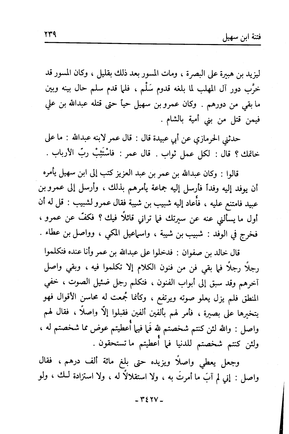 قالوا: وكان عَبْد اللَّهِ بْن عُمَر بْن عَبْد الْعَزِيزِ كتب إلى ابن سهيل يأمره أن يوفد إليه وفدا فأرسل إليه جماعة يأمرهم بذلك، وأرسل إلى عمرو بن عبيد فامتنع عليه، فأعاد إليه شبيب بن شيبة فقال عمرو لشبيب: قل له أن أول ما يسألني عنه عن سيرتك فما تراني قائلًا فيك؟ فكف عن عمرو، فخرج في الوفد: شبيب بن شيبة، وإسماعيل المكي، وواصل بن عطاء.