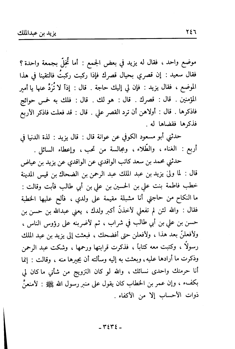 حَدَّثَنِي أَبُو مَسْعُود الكوفي عَنْ عوانة قَالَ: قال يزيد: لذة الدنيا في أربع: الغناء، والطلاء، ومجالسة من تحب، وإعطاء السائل.