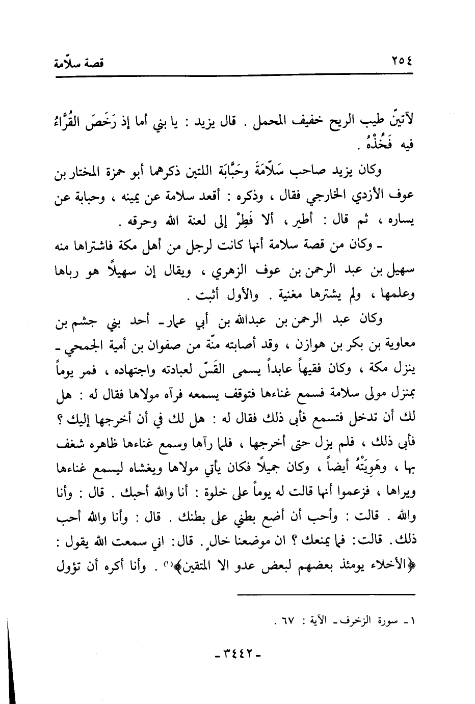 - وكان من قصة سلامة أنها كانت لرجل من أهل مكة فاشتراها منه سهيل بن عبد الرحمن بن عوف الزهري، ويقال إن سهيلًا هو رباها وعلمها، ولم يشترها مغنية. والأول أثبت.
