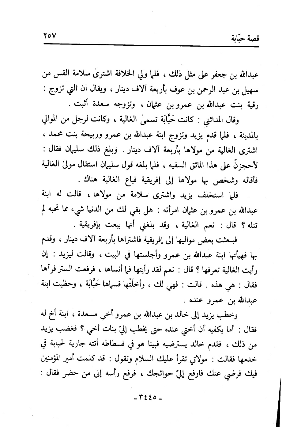 عبد الله بن جعفر على مثل ذلك، فلما ولي الخلافة اشترى سلامة القس من سهيل بن عبد الرحمن بن عوف بأربعة آلاف دينار، ويقال إن التي تزوج: