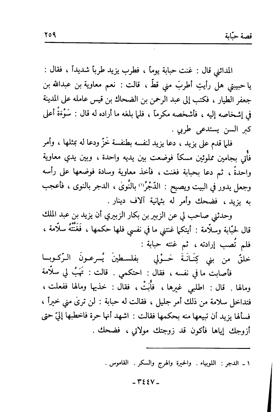 وحدثني صاحب لي عن الزبير بن بكار الزبيري أن يزيد بن عبد الملك قال لحبابة وسلامة: أيتكما غنتني ما في نفسي فلها حكمها، فغنته سلامة، فلم تصب إرادته، ثم غنته حبابة: