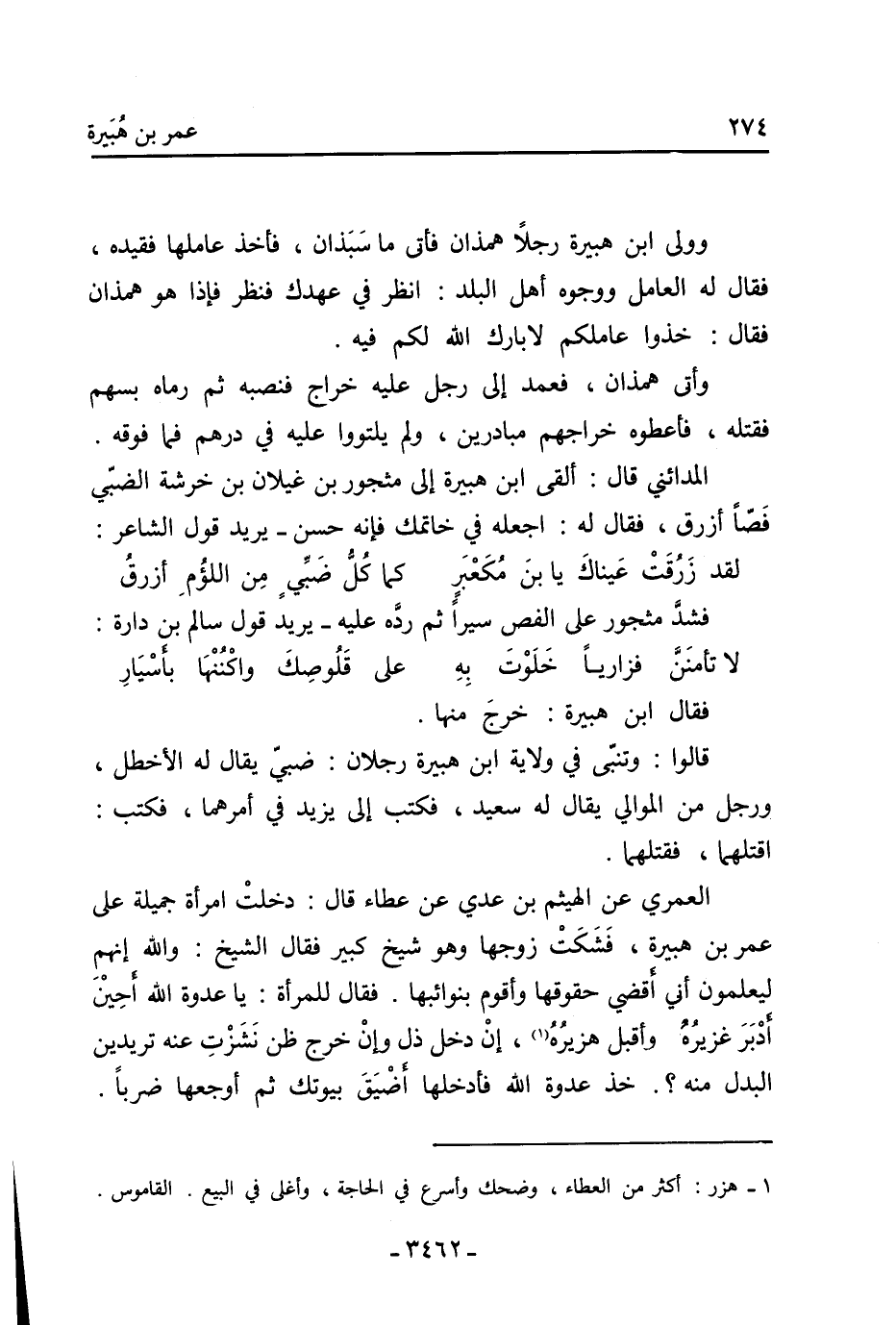 العمري عن الهيثم بن عدي عن عطاء قال: دخلت امرأة جميلة على عمر بن هبيرة، فشكت زوجها وهو شيخ كبير فقال الشيخ: والله إنهم ليعلمون أني أقضي حقوقها وأقوم بنوائبها. فقال للمرأة: يا عدوة الله أحين أدبر غزيره وأقبل هزيره [1] ، إن دخل ذل وإن خرج ظن نشزت عنه تريدين البدل منه؟. خذ عدوة الله فأدخلها أضيق بيوتك ثم أوجعها ضربا.