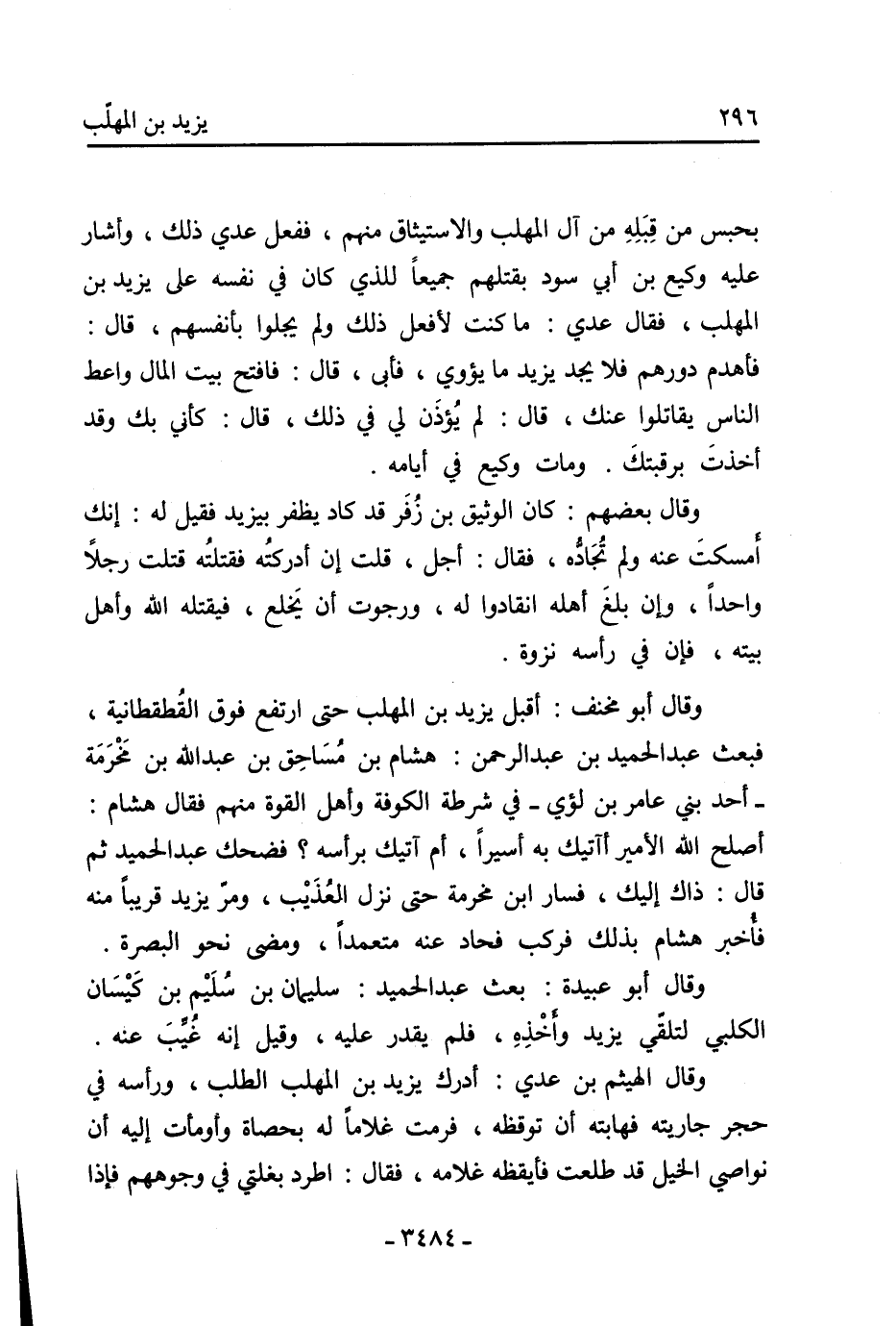 بحبس من قبله من آل المهلب والاستيثاق منهم، ففعل عدي ذلك، وأشار عليه وكيع بن أبي سود بقتلهم جميعا للذي كان في نفسه على يزيد بن المهلب، فقال عدي: ما كنت لأفعل ذلك ولم يجلوا بأنفسهم، قال: