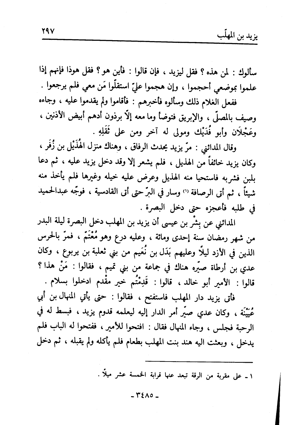 وقال المدائني: مر يزيد يحدث الرفاق، وهناك منزل الهذيل بن زفر، وكان يزيد خائفا من الهذيل، فلم يشعر إلا وقد دخل يزيد عليه، ثم دعا بلبن فشربه فاستحيا منه الهذيل وعرض عليه خيله وغيرها فلم يأخذ منه شيئا، ثم أتى الرصافة [1] وسار في البر حتى أتى القادسية، فوجه عبد الحميد في طلبه فأعجزه حتى دخل البصرة.