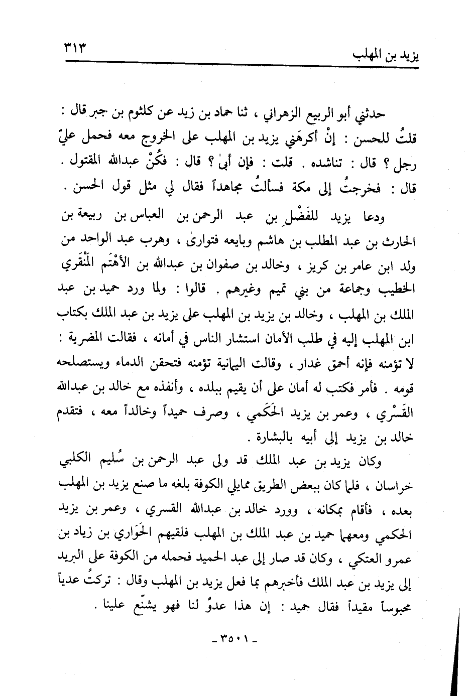 قلت للحسن: إن أكرهني يزيد بن المهلب على الخروج معه فحمل علي رجل؟ قال: تناشده. قلت: فإن أبى؟ قال: فكن عبد الله المقتول.