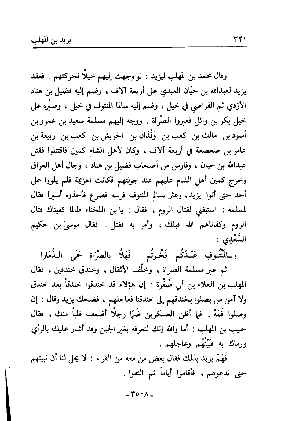 ثم عبر مسلمة الصراة، وخلف الأثقال، وخندق خندقين، فقال المهلب بن العلاء بن أبي صفره: إن هؤلاء قد خندقوا خندقا بعد خندق ولا آمن من يصلوا بخندقهم إلى خندقنا فعاجلهم، فضحك يزيد وقال: إن وصلوا فمه. فما أظن العسكرين ضما رجلًا أضعف قلبا منك، فقال حبيب بن المهلب: أما والله إنك لتعرفه بغير الجبن وقد أشار عليك بالرأي ورماك به فبيتهم وعاجلهم.