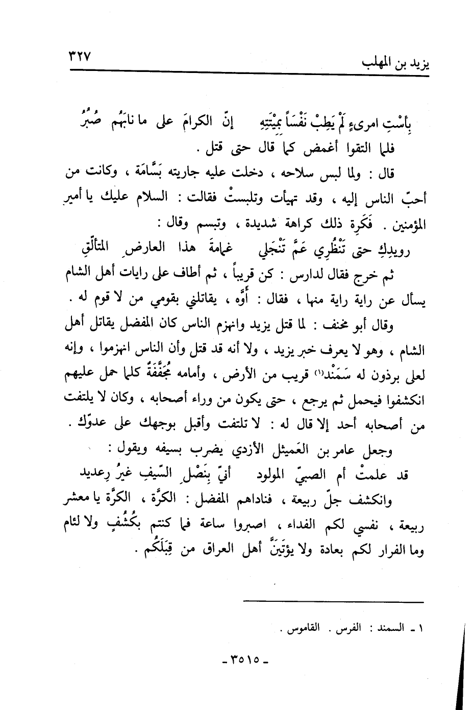 وقال أبو مخنف: لما قتل يزيد وانهزم الناس كان المفضل يقاتل أهل الشام، وهو لا يعرف خبر يزيد، ولا أنه قد قتل وأن الناس انهزموا، وإنه لعلى برذون له سمند [1] قريب من الأرض، وأمامه مجففة كلما حمل عليهم انكشفوا فيحمل ثم يرجع، حتى يكون من وراء أصحابه، وكان لا يلتفت من أصحابه أحد إلا قال له: لا تلتفت وأقبل بوجهك على عدوك.