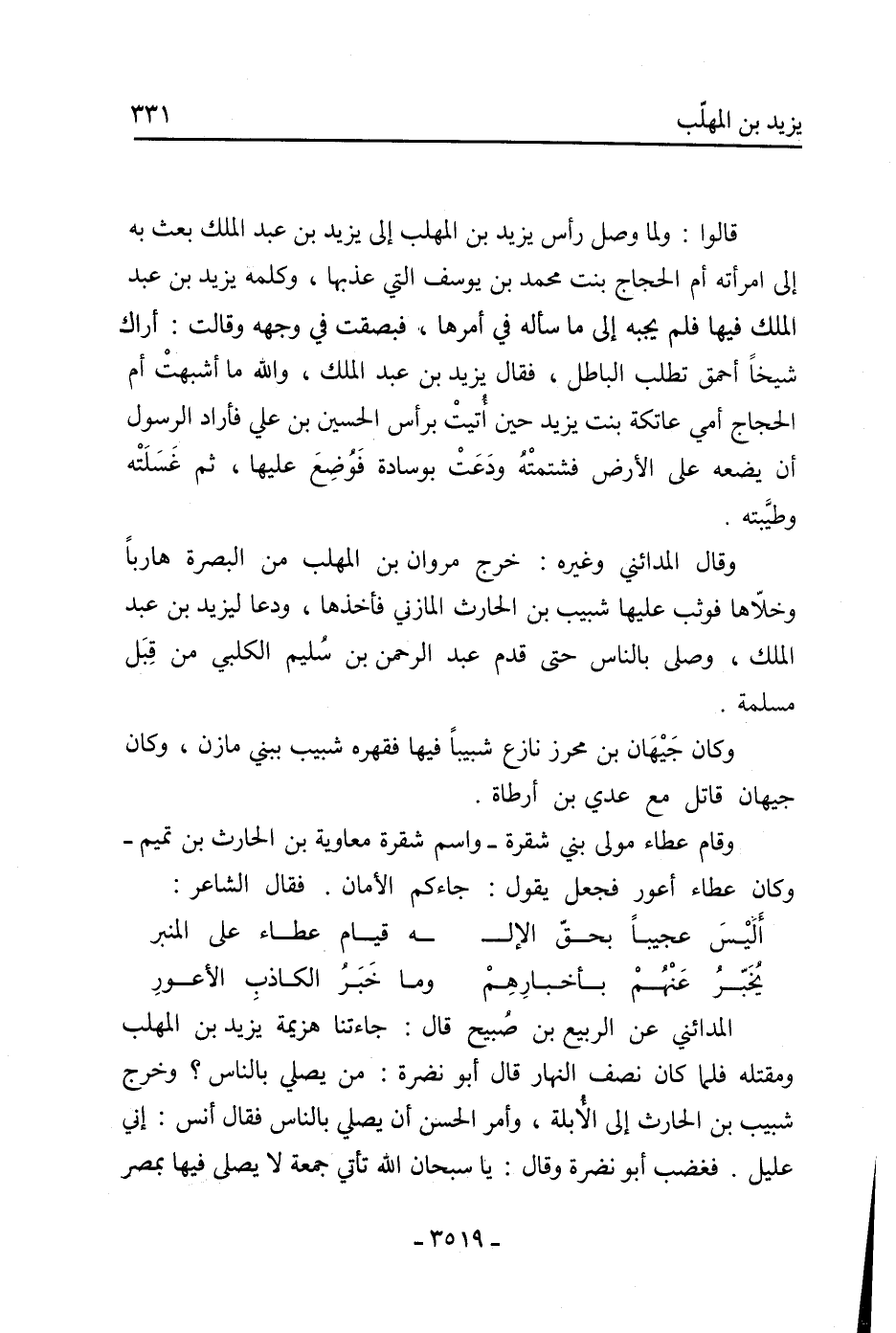 قالوا: ولما وصل رأس يزيد بن المهلب إلى يزيد بن عبد الملك بعث به إلى امرأته أم الحجاج بنت محمد بن يوسف التي عذبها، وكلمه يزيد بن عبد الملك فيها فلم يجبه إلى ما سأله في أمرها، فبصقت في وجهه وقالت: أراك شيخا أحمق تطلب الباطل، فقال يزيد بن عبد الملك، والله ما أشبهت أم الحجاج أمي عاتكة بنت يزيد حين أتيت برأس الحسين بن علي فأراد الرسول أن يضعه على الأرض فشتمته ودعت بوسادة فوضع عليها، ثم غسلته وطيبته.