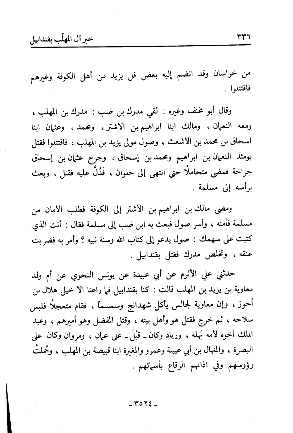 حدثني علي الأثرم عن أبي عبيدة عن يونس النحوي عن أم ولد معاوية بن يزيد بن المهلب قالت: كنا بقندابيل فما راعنا إلا خيل هلال بن أحوز، وإن معاوية لجالس يأكل شهدانج وسمسما، فقام متعجلًا فلبس سلاحه، ثم خرج فقتل هو وأهل بيته، وقتل المفضل وهو أميرهم، وعبد الملك أخوه لأمه بهلة، وزياد وكان- قيل- على عمان، ومروان وكان على البصرة، والمنهال بن أبي عيينة وعمرو والمغيرة ابنا قبيصة بن المهلب، وحملت رؤوسهم وفي آذانهم الرقاع بأسمائهم.