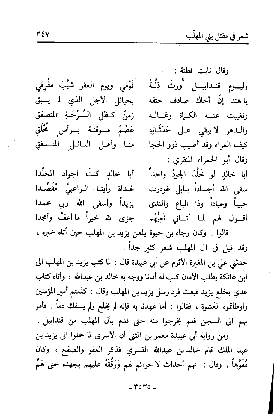 حَدَّثَنِي عَلِيُّ بْنُ الْمُغِيرَةَ الأَثْرَمُ عَنْ أَبِي عبيدة قال: لما كتب يزيد بن المهلب إلى ابن عاتكة يطلب الأمان كتب له أمانا ووجه به خالد بن عبد الله، وأتاه كتاب عدي بخلع يزيد فبعث فرد رسل يزيد بن المهلب وقال: كذبتم أمير المؤمنين وأوطأتموه العشوة، فقالوا: أما عهدنا به فإنه لم يخلع ولم يسفك دما. فأمر بهم إلى السجن فلم يخرجوا منه حتى قدم بآل المهلب من قندابيل.