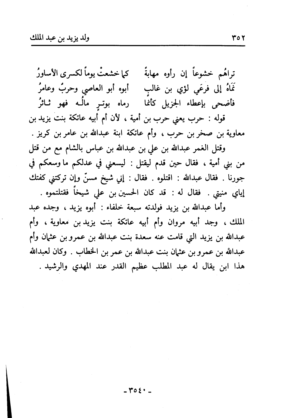 وأما عبد الله بن يزيد فولدته سبعة خلفاء: أبوه يزيد، وجده عبد الملك، وجد أبيه مروان وأم أبيه عاتكة بنت يزيد بن معاوية، وأم عبد الله بن يزيد التي قامت عنه سعدة بنت عبد الله بن عمرو بن عثمان وأم عبد الله بن عمرو بن عثمان بنت عَبْد اللَّهِ بْن عُمَر بْن الْخَطَّاب. وكان لعبد الله هذا ابن يقال له عبد المطلب عظيم القدر عند المهدي والرشيد.