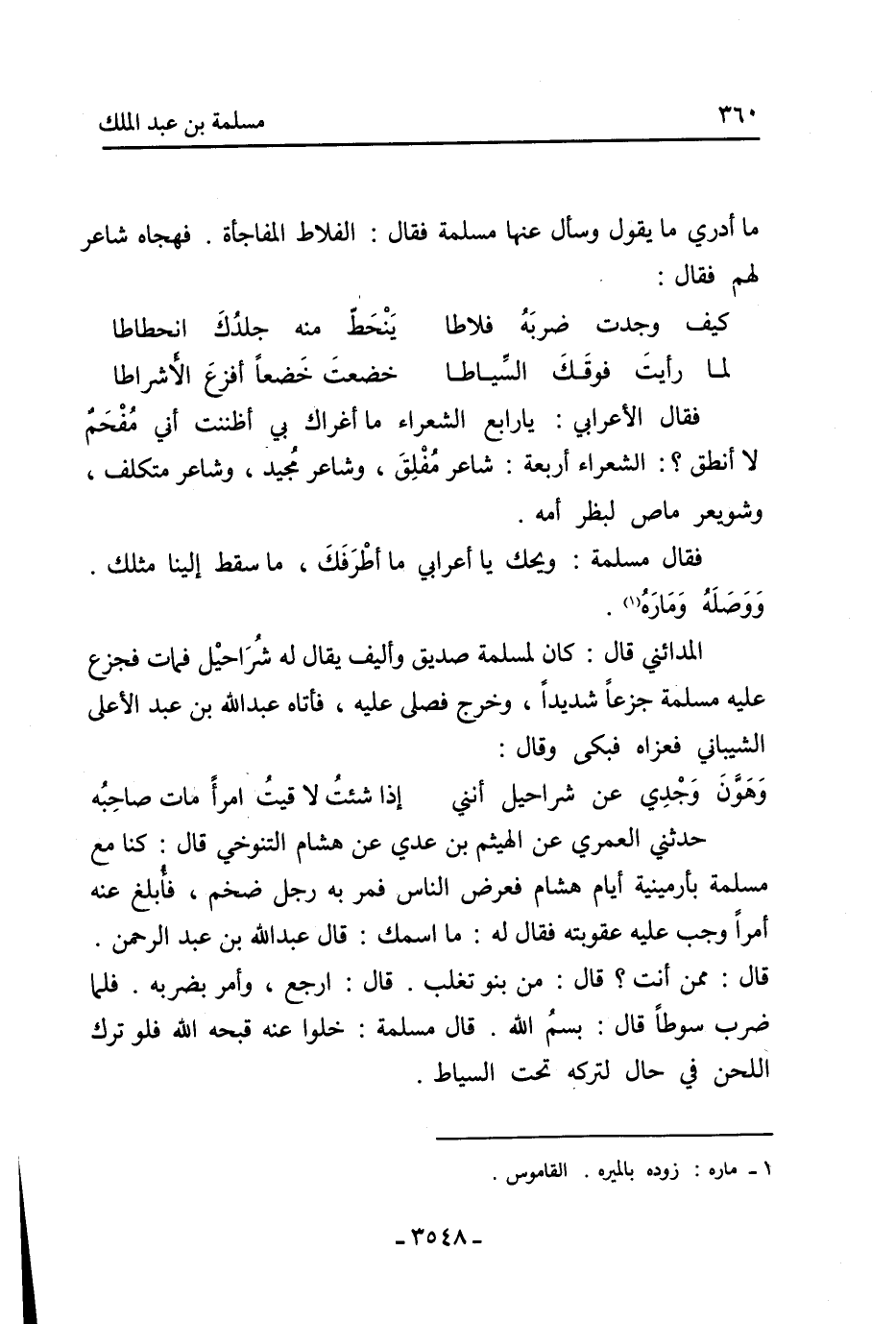 قال: ممن أنت؟ قال: من بنو تغلب. قال: ارجع، وأمر بضربه. فلما ضرب سوطا قال: بسم الله. قال مسلمة: خلوا عنه قبحه الله فلو ترك اللحن في حال لتركه تحت السياط.
