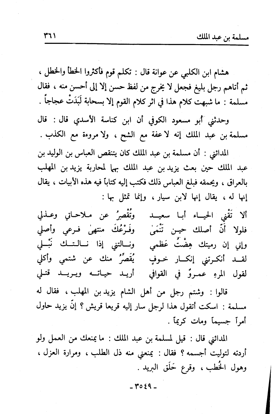 وحدثني أبو مسعود الكوفي أن ابن كناسة الأسدي قال: قال مسلمة بن عبد الملك إنه لا عفة مع الشح، ولا مروءة مع الكذب.