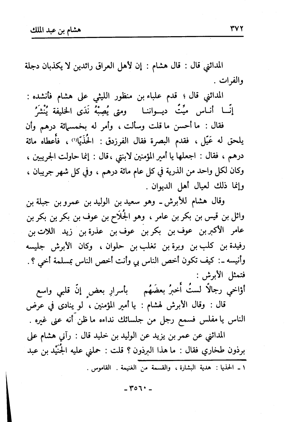 فقال: ما أحسن ما قلت وسألت، وأمر له بخمسمائة درهم وأن يلحق له عيل، فقدم البصرة فقال الفرزدق: الحذيا [1] ، فأعطاه مائة درهم، فقال: اجعلها يا أمير المؤمنين لابنتي، قال: إنما حاولت الجريبين، وكان لكل واحد من الذرية في كل عام مائة درهم، وفي كل شهر جريبان، وإنما ذلك لعيال أهل الديوان.
