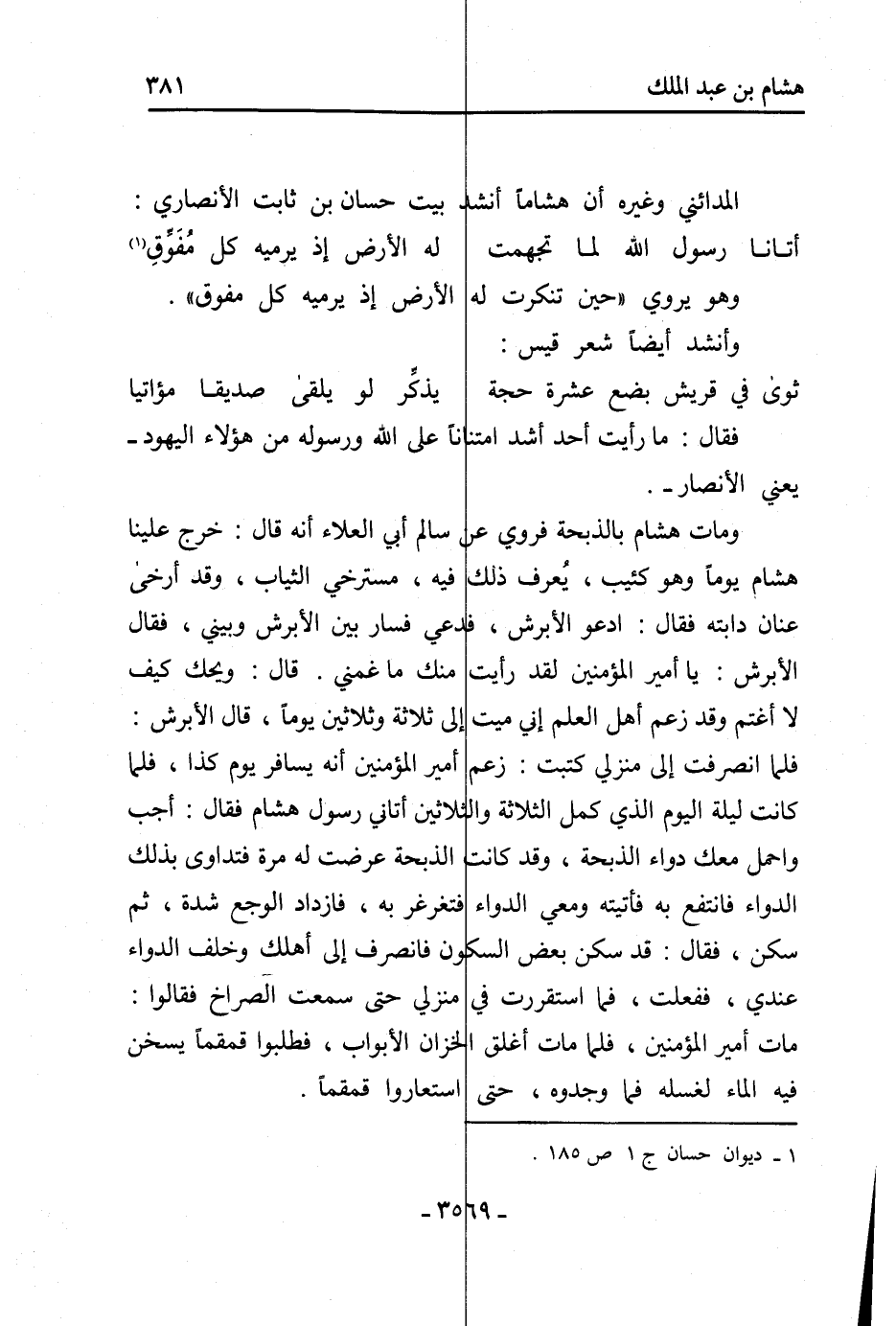 المدائني وغيره أن هشاما أنشد بيت حسان بن ثابت الأنصاري: