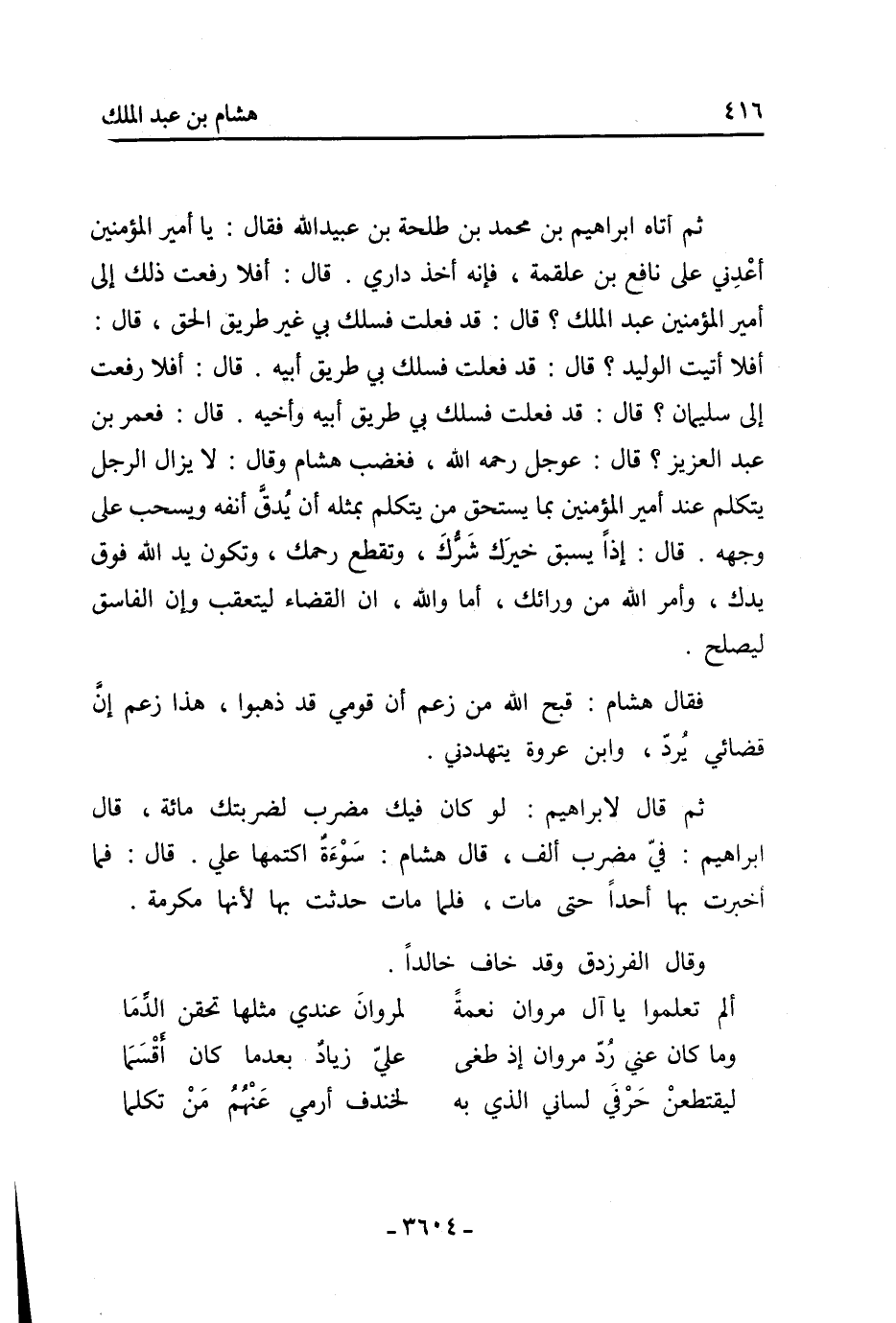 ثم آتاه إِبْرَاهِيمَ بْن مُحَمَّد بْن طَلْحَة بْن عُبَيْدِ الله فقال: يا أمير المؤمنين أعدني على نافع بن علقمة، فإنه أخذ داري. قال: أفلا رفعت ذلك إلى أمير المؤمنين عبد الملك؟ قال: قد فعلت فسلك بي غير طريق الحق، قال: