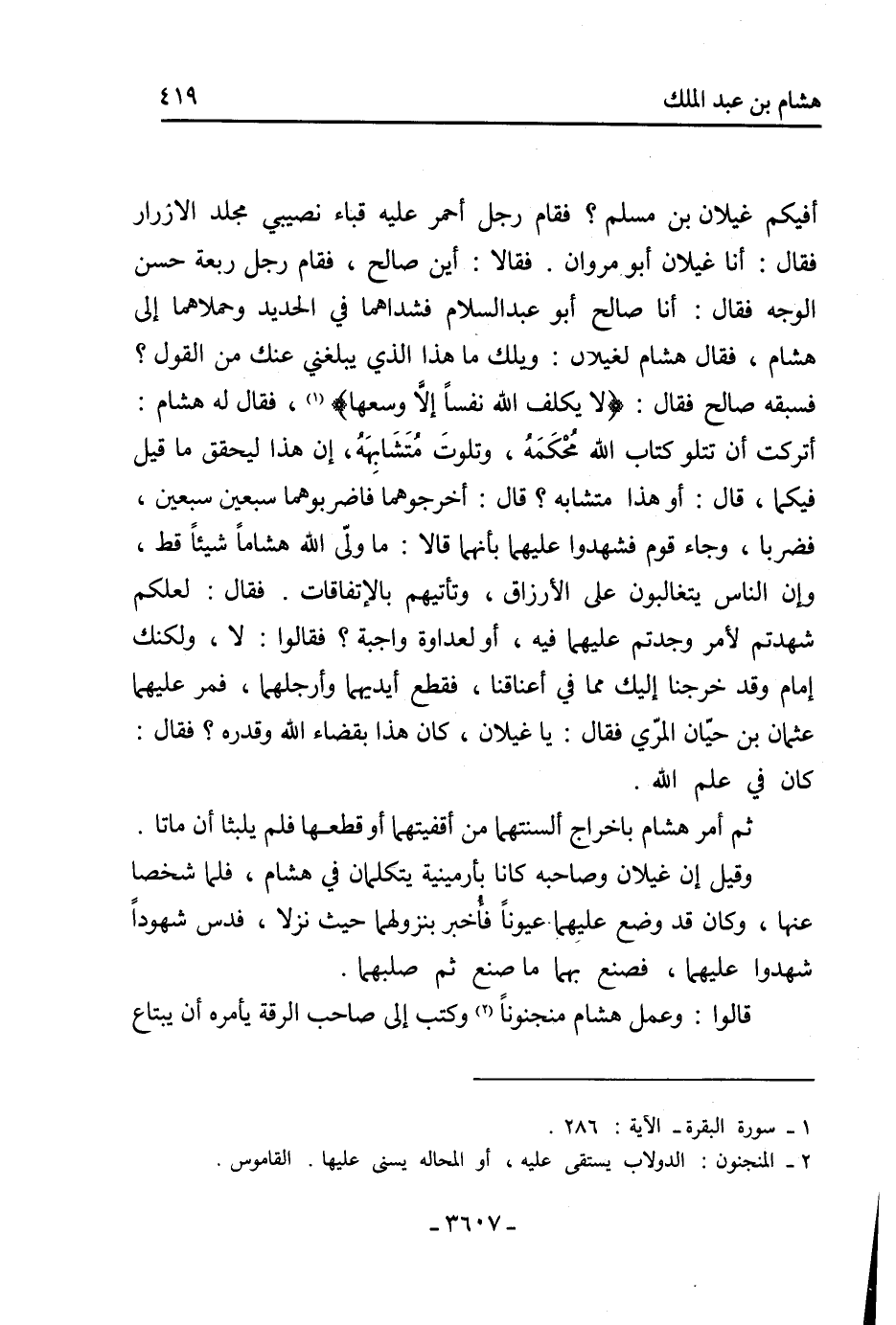 أتركت أن تتلو كتاب الله محكمه، وتلوت متشابهه، إن هذا ليحقق ما قيل فيكما، قال: أو هذا متشابه؟ قال: أخرجوهما فاضربوهما سبعين سبعين، فضربا، وجاء قوم فشهدوا عليهما بأنهما قالا: ما ولى الله هشاما شيئا قط، وإن الناس يتغالبون على الأرزاق، وتأتيهم بالاتفاقات. فقال: لعلكم شهدتم لأمر وجدتم عليهما فيه، أو لعداوة واجبة؟ فقالوا: لا، ولكنك إمام وقد خرجنا إليك مما في أعناقنا، فقطع أيديهما وأرجلهما، فمر عليهما عثمان بن حيان المري فقال: يا غيلان، كان هذا بقضاء الله وقدره؟ فقال: