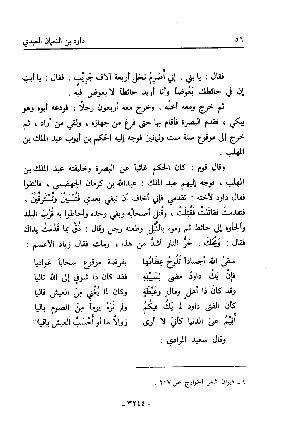 وقال قوم: كان الحكم غائبا عن البصرة وخليفته عبد الملك بن المهلب، فوجه إليهم عبد الملك: عبد الله بن كرمان الجهضمي، فالتقوا فقال داود لأخته: تقدمي فإني أخاف أن تبقي بعدي فتسبين وتسترقين، فتقدمت فقاتلت فقتلت، وقتل أصحابه وبقي وحده وأحاطوا به قرب البلد وألجأوه إلى حائط ثم رموه بالنبل وطعنه رجل وقال: ذق بما قدمت يداك فقال: ويحك، حر النار أشد من هذا، ومات فقال زياد الأعسم: