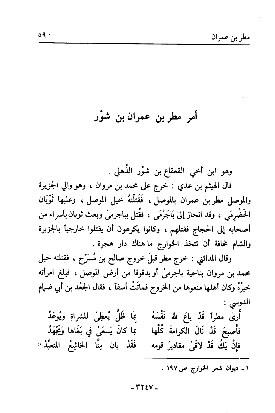 وقال المدائني: خرج مطر قبل خروج صالح بن مسرح، فقتلته خيل محمد بن مروان بناحية باجرمى أو بدقوقا من أرض الموصل، فبلغ امرأته خبره وكان أهلها منعوها من الخروج فماتت أسفا، فقال الجعد بن أبي ضمام الدوسي:
