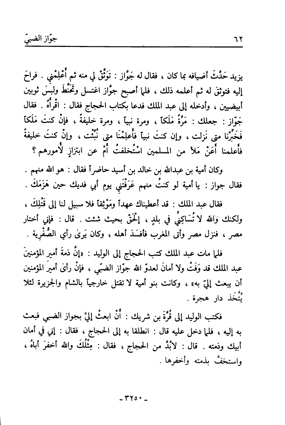 فكتب الوليد إلى قرة بن شريك: أن ابعث إليّ بجواز الضبي فبعث به إليه، فلما دخل عليه قال: انطلقا به إلى الحجاج، فقال: إني في أمان أبيك وذمته. قال: لا بدّ من الحجاج، فقال: مثلك والله أخفر أباه، واستخف بذمته وأخفرها.